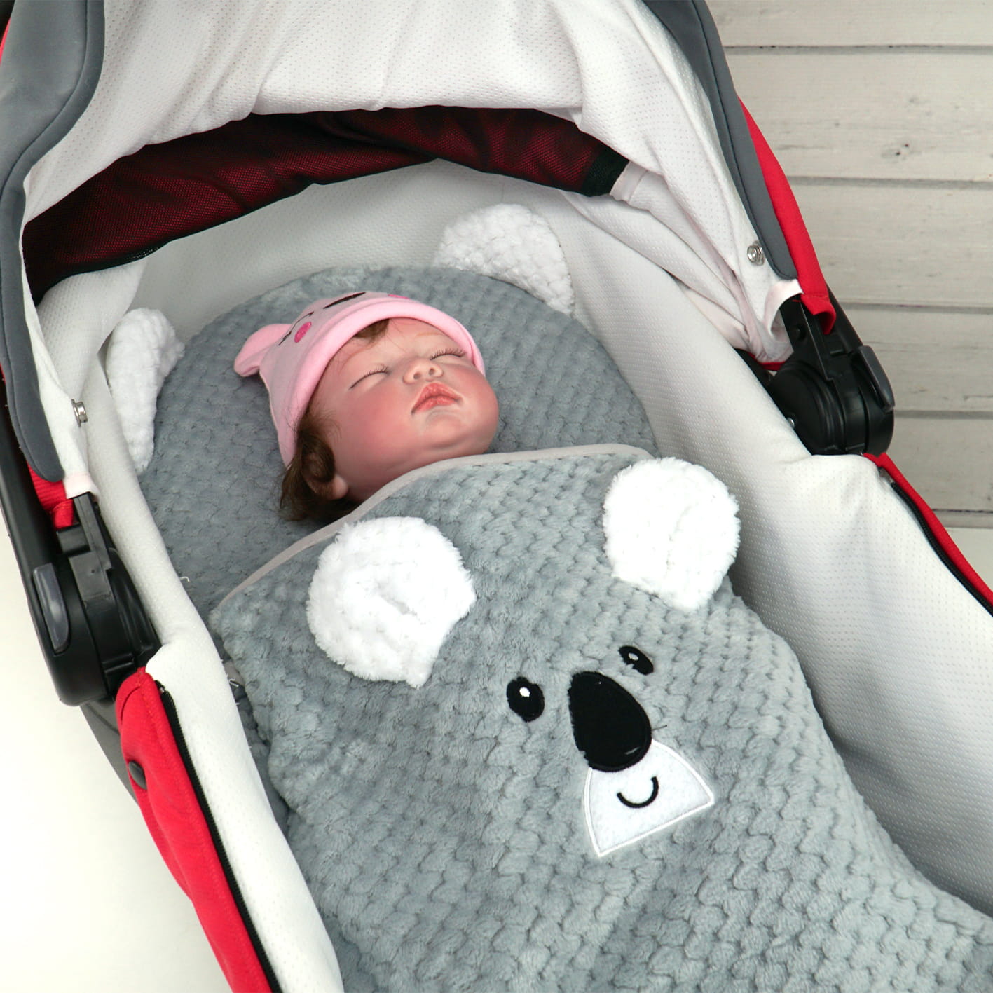 Kocyk posiada nahaftowaną słodką główkę koali i doszyte uszka z miękkiej mikrofibry. Aplikacja sprawia, że kocyk staje się znacznie bardziej atrakcyjny dla maluszka. Uszka na pewno zainteresują dziecko i będą dodatkową atrakcją