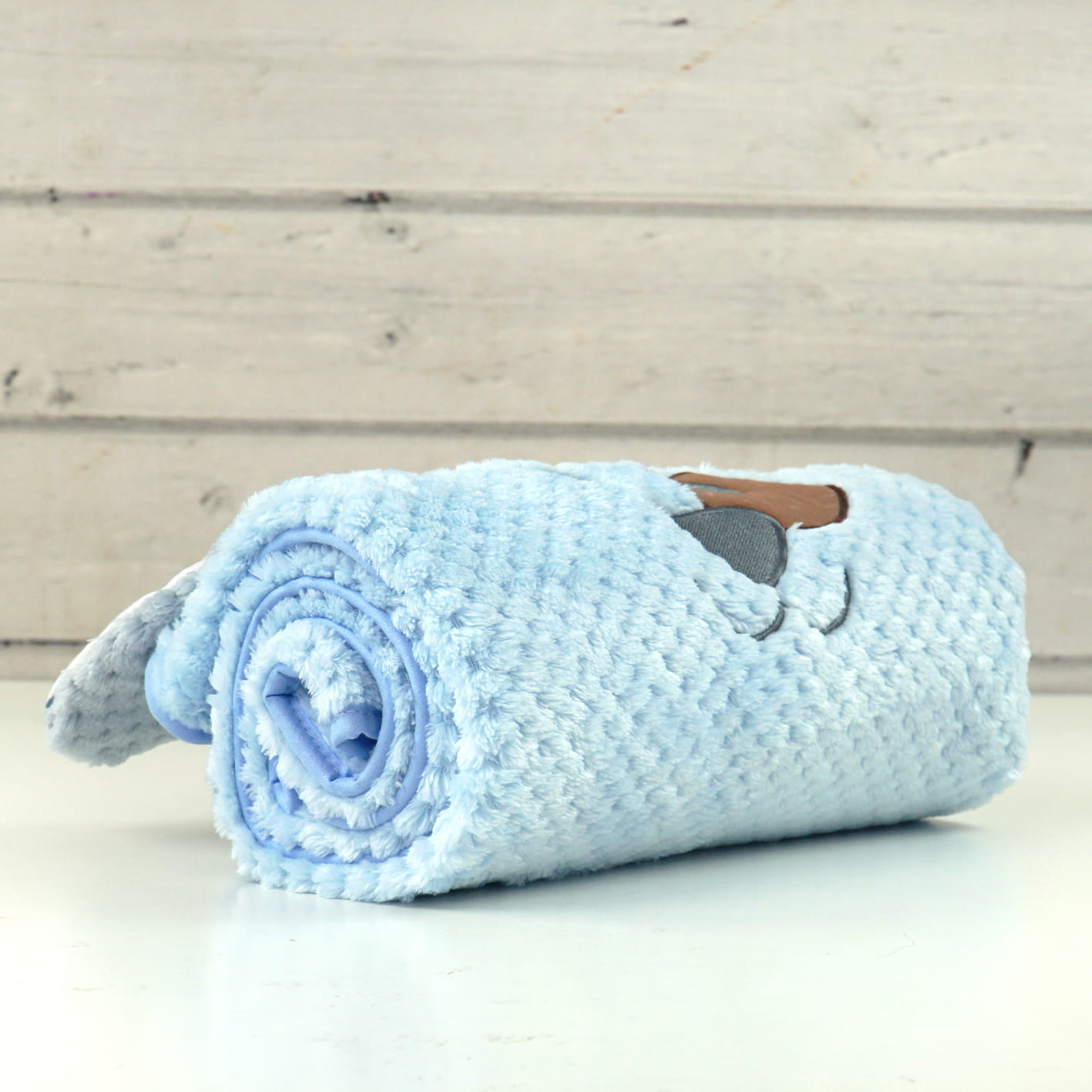 Kocyk posiada nahaftowaną słodką główkę pieska i doszyte uszka z kolorowej bawełny (na każdym kocyku uszka mają różne wzory bawełny dopierane kolorystycznie) połączonej z miękką mikrofibrą. Aplikacja sprawia, że kocyk staje się znacznie bardziej atrakcyjny dla maluszka.