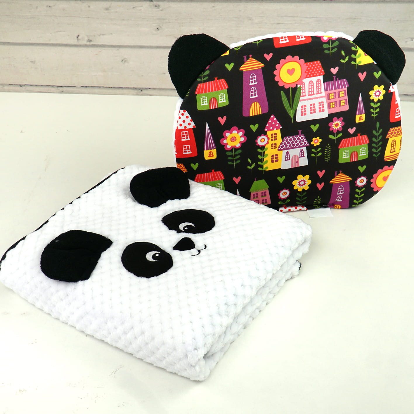 Podusia ma doszyte urocze uszka, które uatrakcyjniają dodatkowo zestaw. Z jednej strony poduszka jest uszyta z miękkiego jacquardu, a z drugiej z kolorowej bawełny. Każdy zestaw jest wyjątkowy i niepowtarzalny, ponieważ bawełna ma inny wzór wkomponowany kolorystycznie.