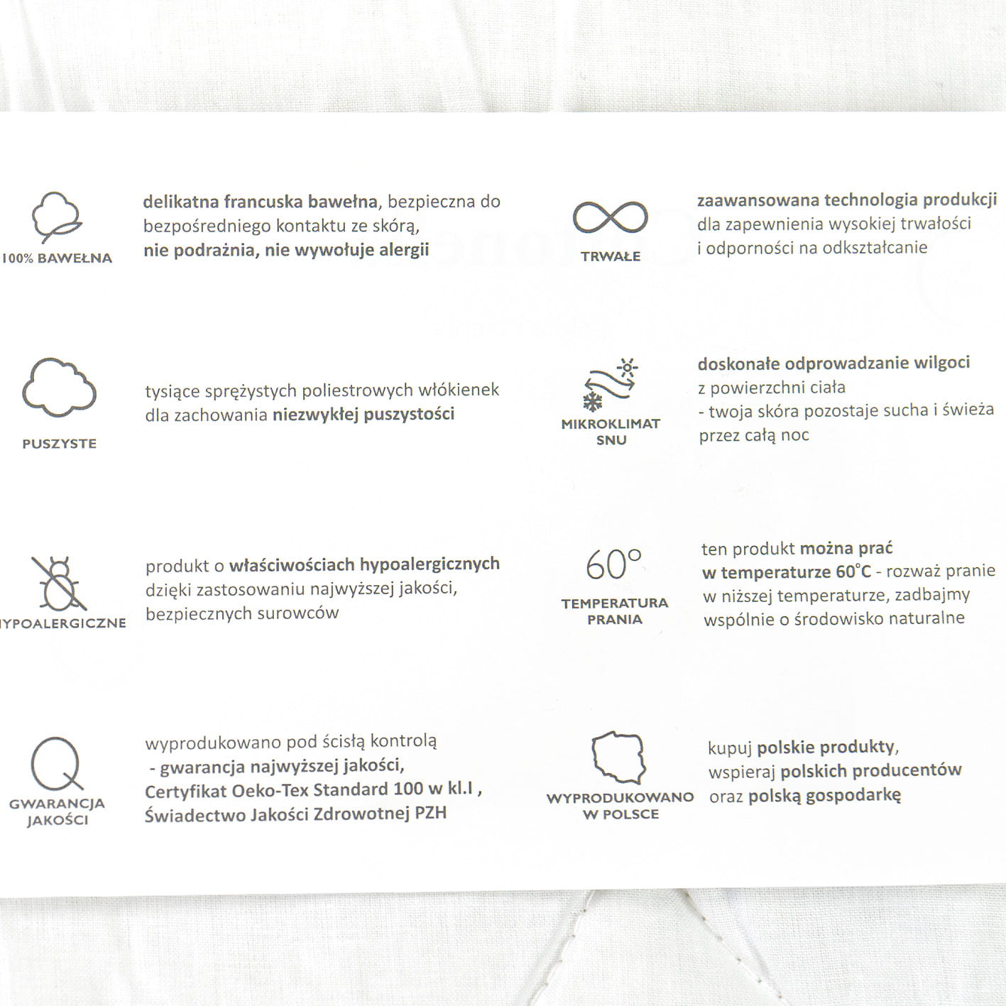 Kołdra posiada pikowanie kopertowe na całej swojej powierzchni. W każdym kwadracie znajduje się taka sama ilość wypełnienia, a pikowanie zabezpiecza przed przesuwaniem się wypełnienia w jedno miejsce. Kołdra więc równomiernie, na całej swojej powierzchni trzyma ciepło.