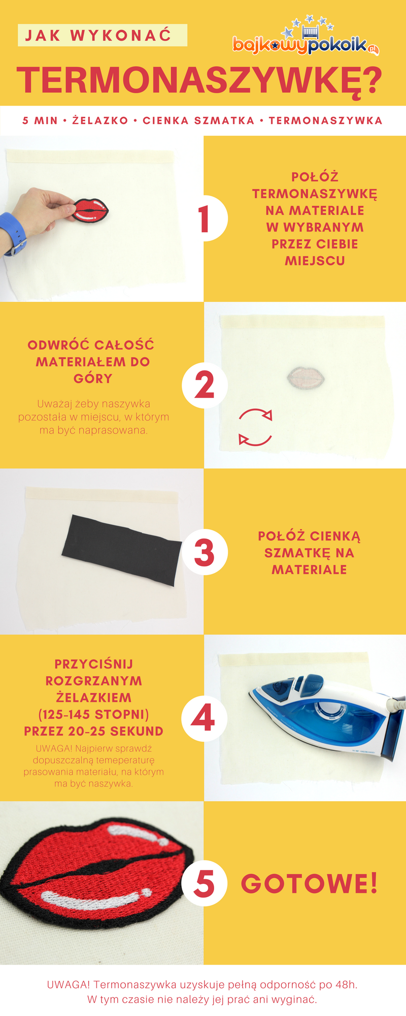 Naszywkę można przyprasować lub przyszyć - idealnie nadaje się do ozdobienia dowolnej tkaniny np. ubrania czy plecaka.