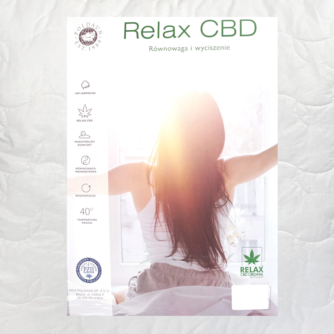Obecnie z problem bezsenności boryka się połowa społeczeństwa. Najczęstszymi powodami są nowe technologie, stres, szybkie tempo życia, czy pandemia. Osoby, które mają problem z zasypianiem, czy częstym budzeniem się w nocy następnego dnia są zdenerwowane, sfrustrowane i nieefektywne, a ich zdrowie podupada coraz bardziej. Linia RELAX CBD pojawiła się właśnie, aby ten problem rozwiązać. Tkanina zewnętrzna została pokryta specjalnym wyciągiem z olejku konopnego RELAX CBD ORGINAL by Proneem France. Zapewni on spokojniejszy i głęboki sen, bez nerwowego zasypiania i budzenia się.