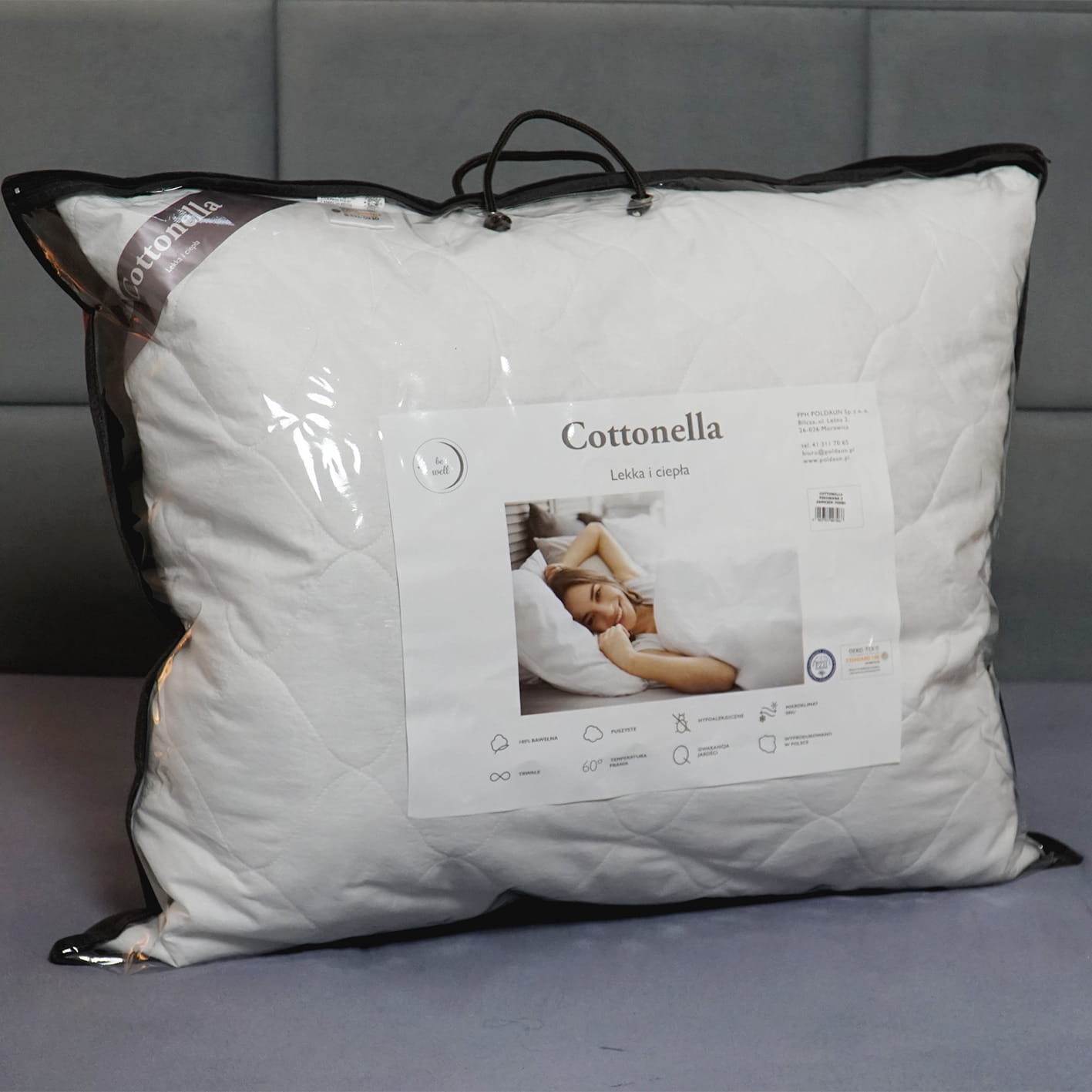 Poduszka Cottonella to produkt POLSKI, wyprodukowany przez POLDAUN BILCZA. Produkt ten spełnia surowe normy jakościowe, jest to doskonała poduszka antyalergiczna, którą bez obaw można prać w pralce w 60 stopniach, co skutecznie eliminuje roztocza i drobnoustroje