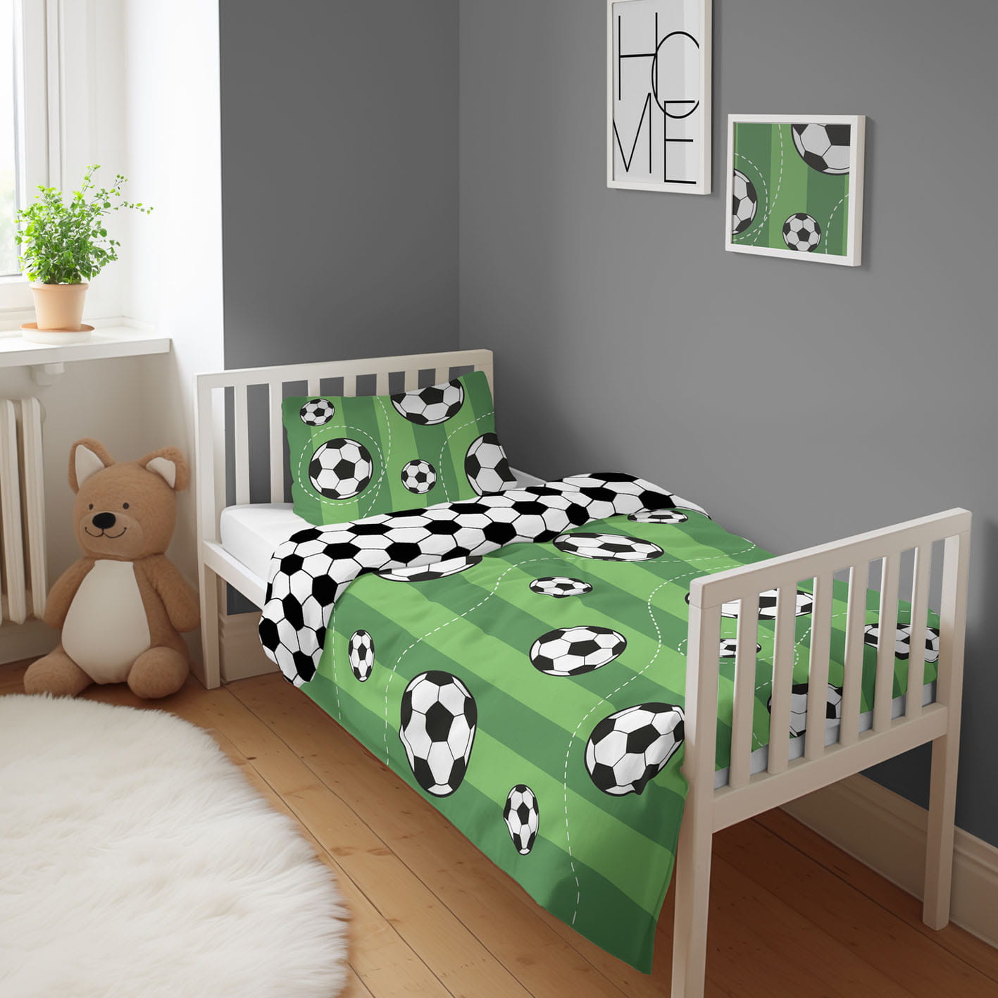 Pościel do łóżka dziecięcego: kołdra i poduszka z nadrukowanym rysunkiem piłek to pomysł na prezent, który sprawi radość każdemu dziecku. Zestaw został wykonany z wysokiej jakości bawełny posiadającej certyfikat Tekstylia Godne Zaufania. W skład kompletu wchodzi poszwa na kołdrę o wymiarach 100x135 cm oraz poszwa na poduszkę o wymiarach 40x60 cm, pasujące do standardowych kołder i poduszek.