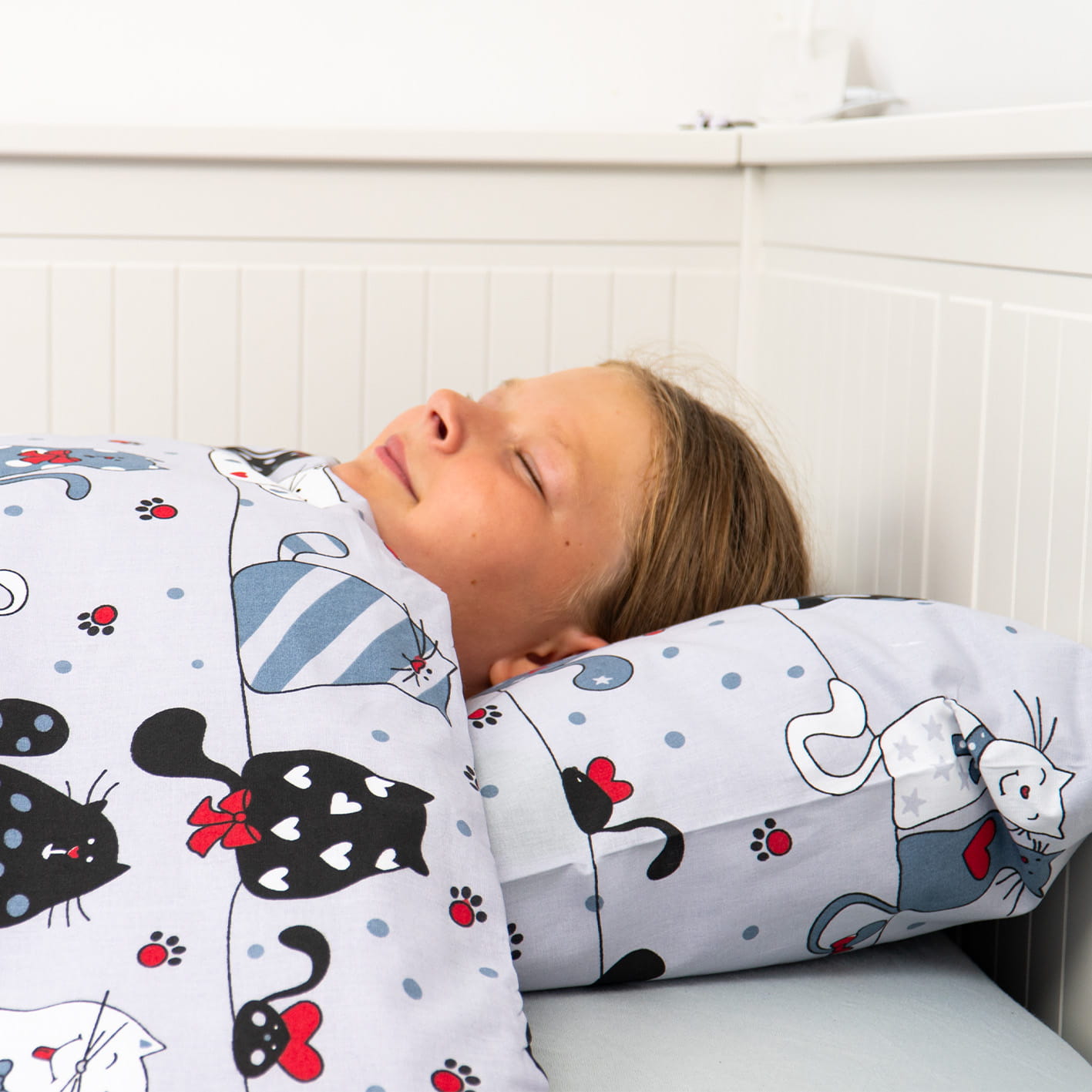 Komplet posiada poszewkę na poduszkę 40x60 cm. W poszewce idealnie mieści się puszysta poduszka dedykowana dla dzieci powyżej 3 roku życia.