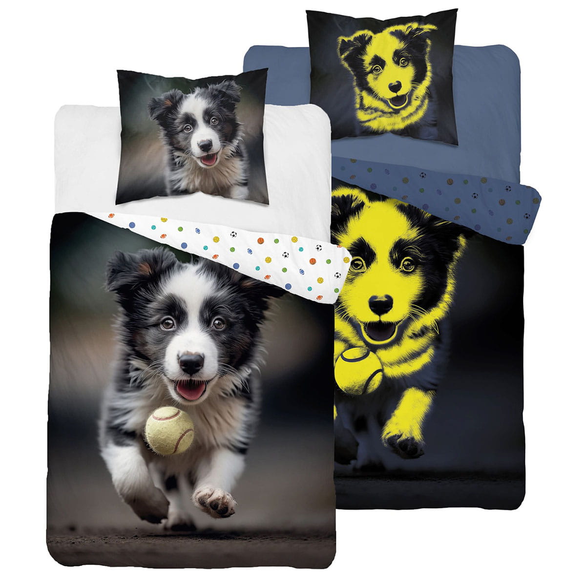 Pościel posiada elementy fluorescencyjne, łagodnie oddaje światło dodając dziecięcemu pokojowi magii. Zdjęcie po lewej przedstawia wygląd pościeli w dzień, zdjęcie po prawej prezentuje wygląd pościeli w ciemności. Elementy fluorescencyjne potrzebują naświetlenia.