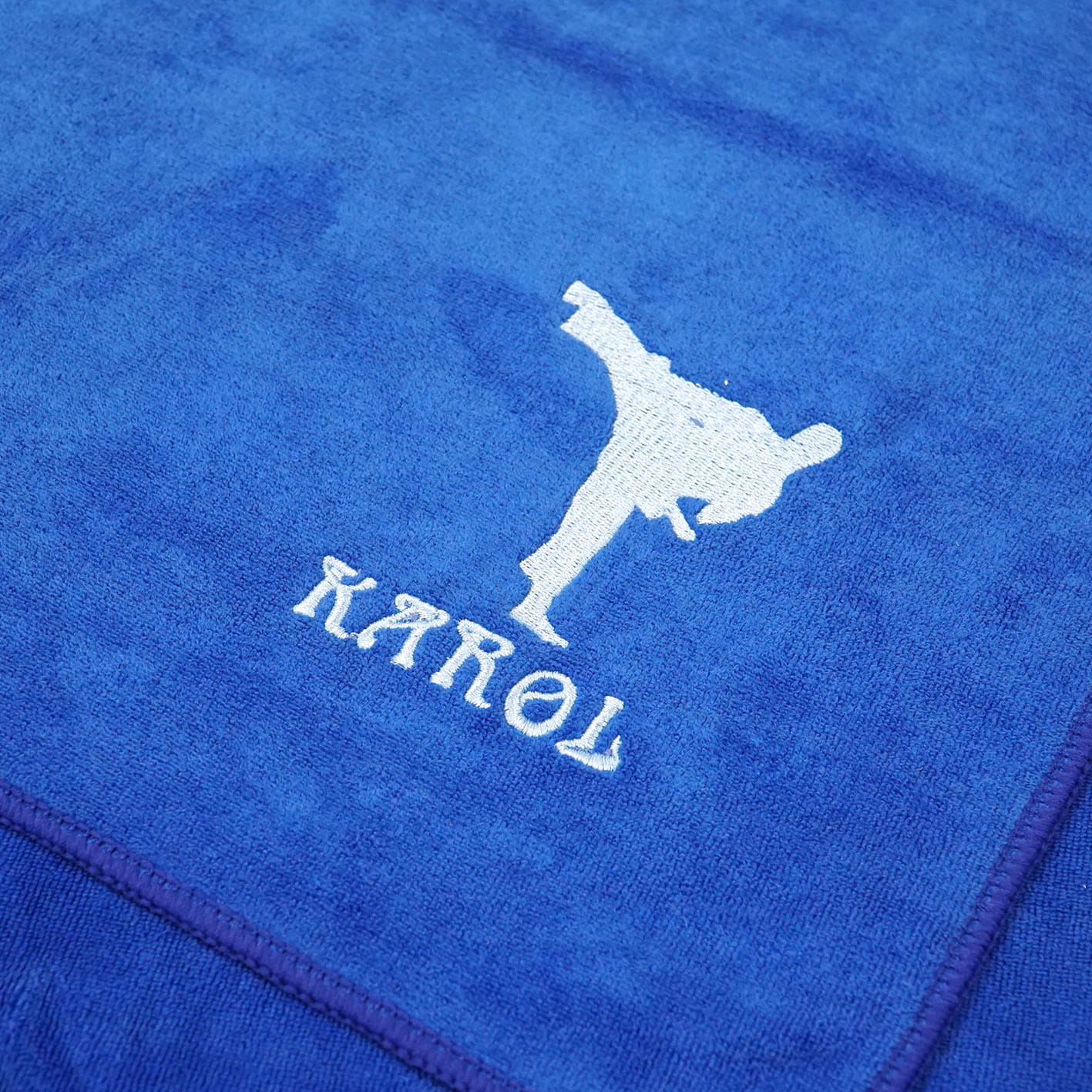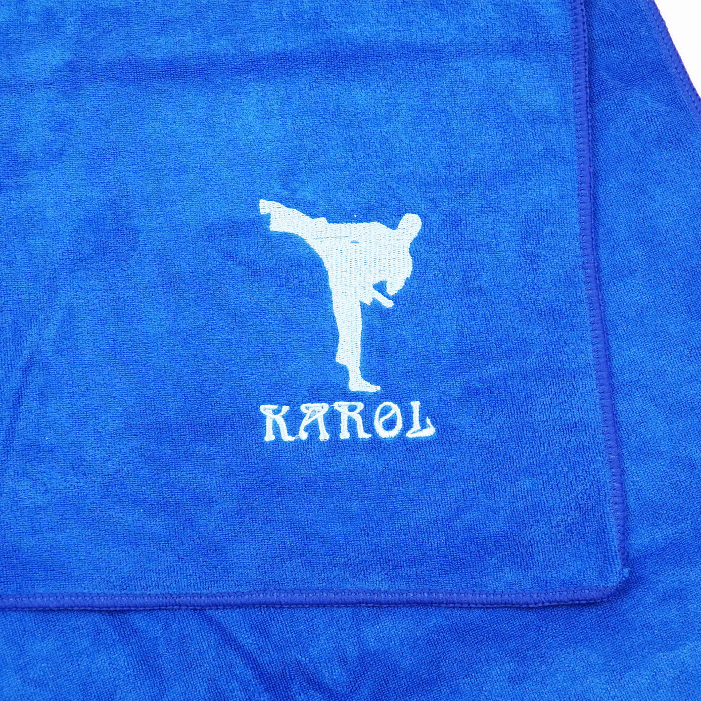 Ręcznik 50x90 cm w kolorze granatowym, haft w kolorze błękitnym z karateką i imieniem Karol