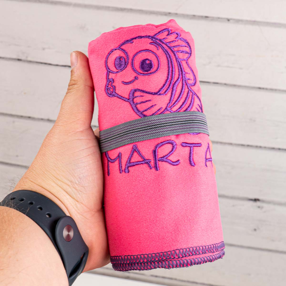 Ręcznik posiada wszytą praktyczną gumkę, która pozwala zarówno na zwinięcie ręcznika w rulon zajmujący bardzo mało miejsca, zwinięcie w "kulkę" mokrego ręcznika, czy na powieszenie ręcznika w dowolnym miejscu.