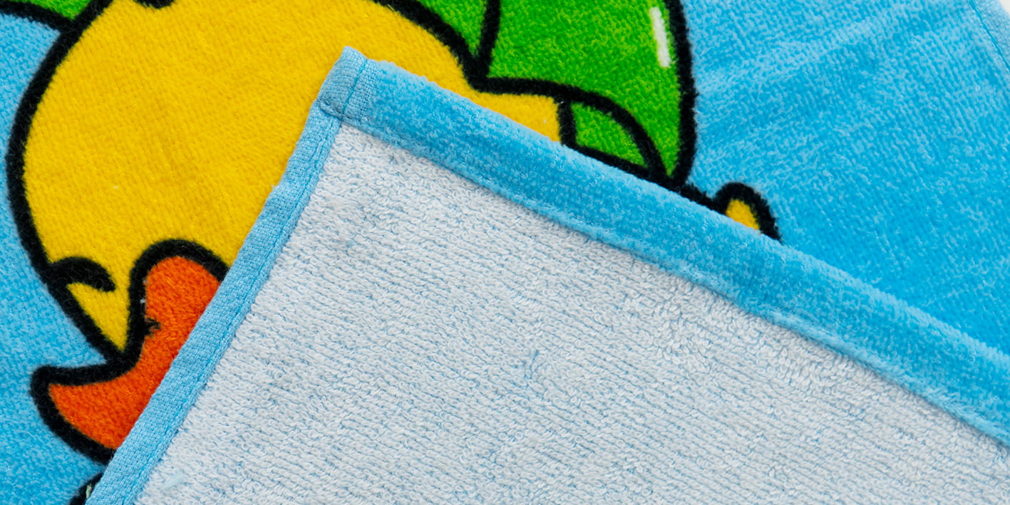 Ręcznik jest starannie obszyty na całym obwodzie - nie będzie się strzępił. Nadruk na ręczniku znajduje się po jednej stronie, po drugiej jest gładki, biały splot bawełny.