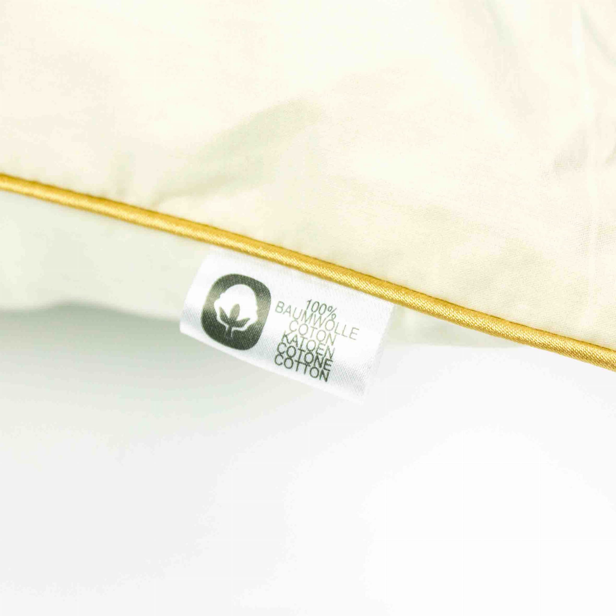 Poduszka puchowa posiada poszycie wykonane w 100% z czystej bawełny bez dodatkowych domieszek poliestru i innych sztucznych elementów. Bawełna użyta do uszycia poszycia jest gruba i doskonale trzyma puch wewnątrz kołdry. Dodatkowo cały obwód poduszki został obszyty lamówką, która znacząco podnosi wytrzymałość poduszki i zabezpiecza przed strzępieniem się.