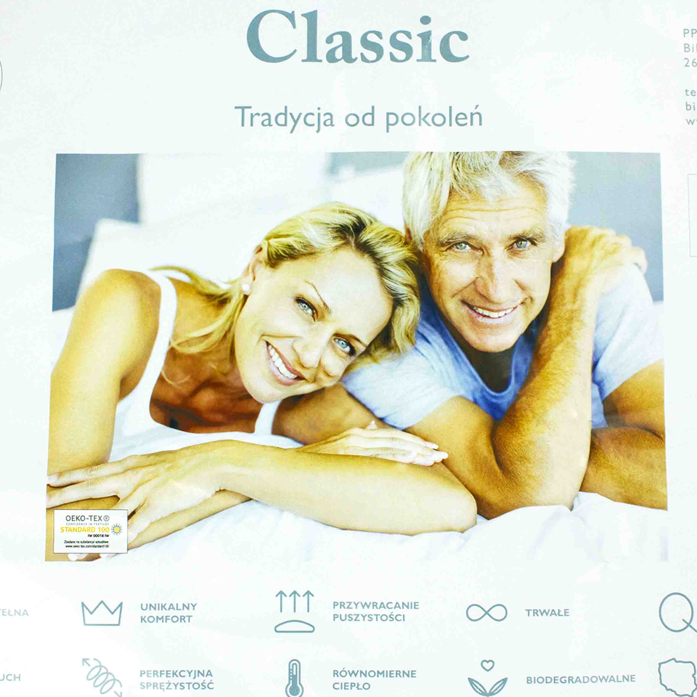 - Wypełnienie: półpuch gęsi 40% (40% puch, 60% piórka)