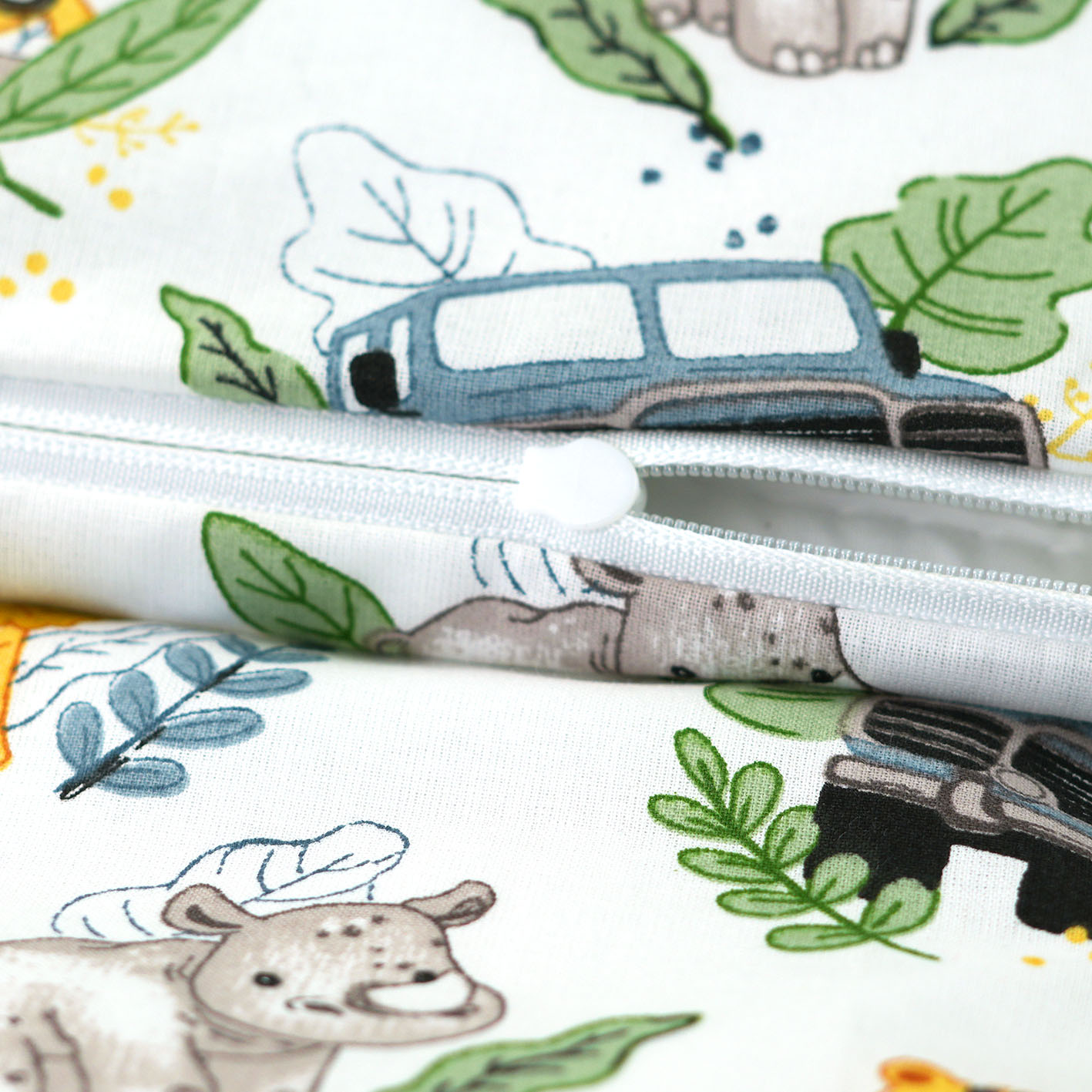 Zarówno poszwa na kołdrę jak i poszewka na poduszkę zapinane są na zamek typu safe. Zamek ten nie posiada wystających elementów, które mogłyby ukłuć dziecko np. w oko. Taki zamek to pełne bezpieczeństwo użytkowania.