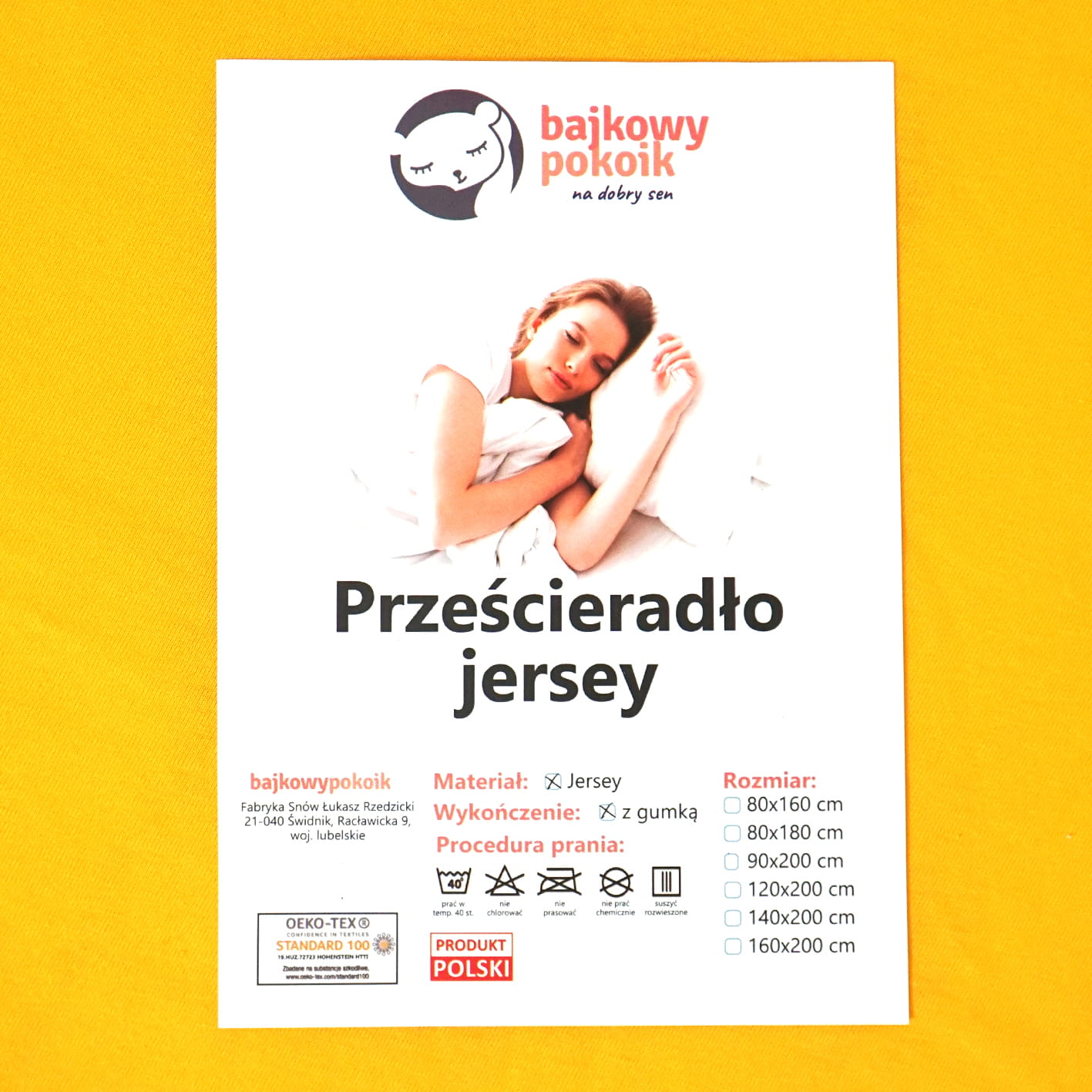 Prześcieradło zostało w całości wyprodukowane w POLSCE, co daje pewność najwyższej jakości. Prześcieradła szyte są na bieżąco, nie są długo magazynowe, nie przechodzą długiego transportu są, więc w pełni "świeże". Tkaniny użyte do uszycia prześcieradła posiadają Certyfikat OEKO TEX STANDARD - zostały przebadane na obecność substancji szkodliwych, co daje pełne bezpieczeństwo, zdrowego snu.